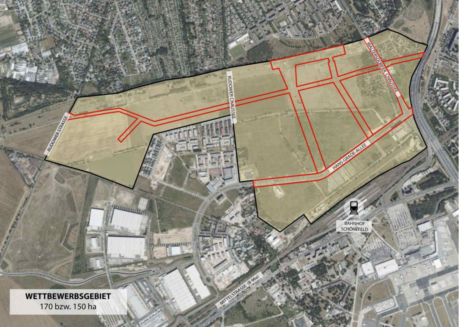 Die Gemeinde Schönefeld besitzt im nördlichen Gemeindegebiet ein riesiges Entwicklungspotenzial. Auf rund 170 Hektar Fläche könnte ein neues Wohnquartier für bis zu 11.500 neue Bewohner entstehen. Im Rahmen eines städtebaulich-freiraumplanerischen Wettbewerbs sucht die Gemeinde in einem ersten Schritt die besten Entwicklungs- und Gestaltungsideen für das Areal. Ziel ist es, nachfolgender Bebauung und Projekten ein übergeordnetes, konzeptionelles Gerüst zu geben.