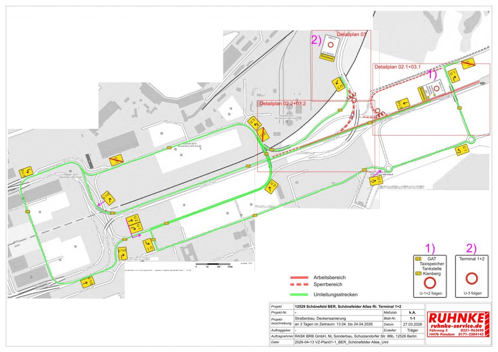 Im Zeitraum vom 13. bis 24. April 2026 kommt es im Bereich der Schönefelder Allee am BER zu Verkehrsbeeinträchtigungen. Aufgrund einer Deckensanierung muss die Straße für den Verkehr halb-, teilweise auch voll gesperrt werden. Die Umleitung ist ausgeschildert.