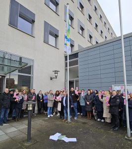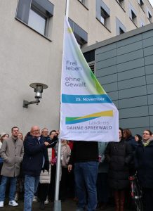 Vor dem Rathaus der Gemeinde Schönefeld fand heute die feierliche Hissung der Fahne „Frei leben ohne Gewalt“ statt. Mit der Aktion setzte die Gemeinde – wie zahlreiche Städte und Gemeinden im gesamten Landkreis – ein sichtbares Zeichen der Solidarität mit Betroffenen von geschlechtsspezifischer Gewalt. Die Fahne wurde um 9.30 Uhr durch Bürgermeister Christian Hentschel im Beisein der Schönefelder Gleichstellungsbeauftragten und zahlreicher Mitarbeitenden der Verwaltung und der Einrichtungen der Gemeinde gehisst. Auch Bürgerinnen und Bürger waren eingeladen, ihre Unterstützung zu zeigen und ein gemeinsames Zeichen gegen Gewalt an Frauen zu setzen.