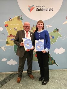 Bürgermeister Christian Hentschel und Illustratorin Verena Dragendorf bei der Buchpräsentation am 24.11. (Fotos: Gemeinde Schönefeld)