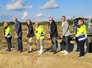 Bürgermeister Christian Hentschel (Mitte) beim symbolischen Spatenstich für die verkehrstechnische Erschließung des Plangebiets Schönefeld Nord. V.l.n.r.: N. Berghof (Sachbearbeiterin Tiefbau), T. Schulz (Geschäftsführer PST GmbH), S. Bley (Verbandsvorsteherin MAWV), C. Hentschel (Bürgermeister Gemeinde Schönefeld), M. Matheis (Abteilung Vertrieb e.distherm), V. Brühl (techn. Bereichsleiter STRABAG AG) und A. Schwuchow (Sachgebietsleiterin Tiefbau und Infrastruktur) / Foto: Gemeinde Schönefeld